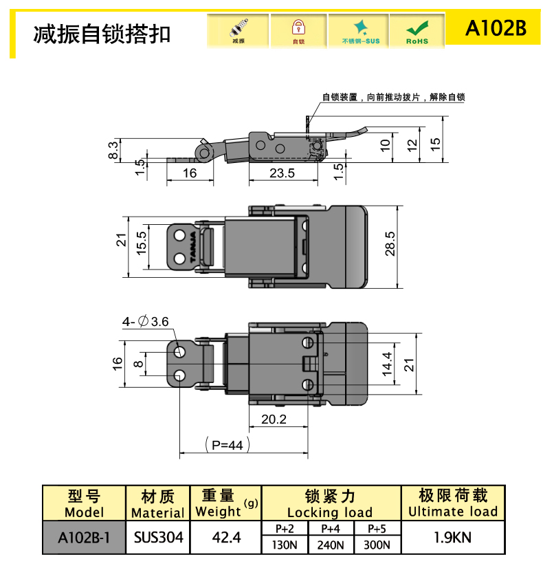 | A102B-1 | Самоблокировка,Амортизация | 68.8 | СУС304 | 42.41 | 130 | 1900 | Download |