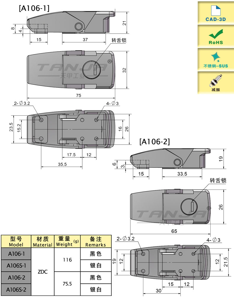| A106-1BK | Внутренняя пряжка, амортизация,С замком | 75.5 | Цинковый сплав | 122.01 | Download |