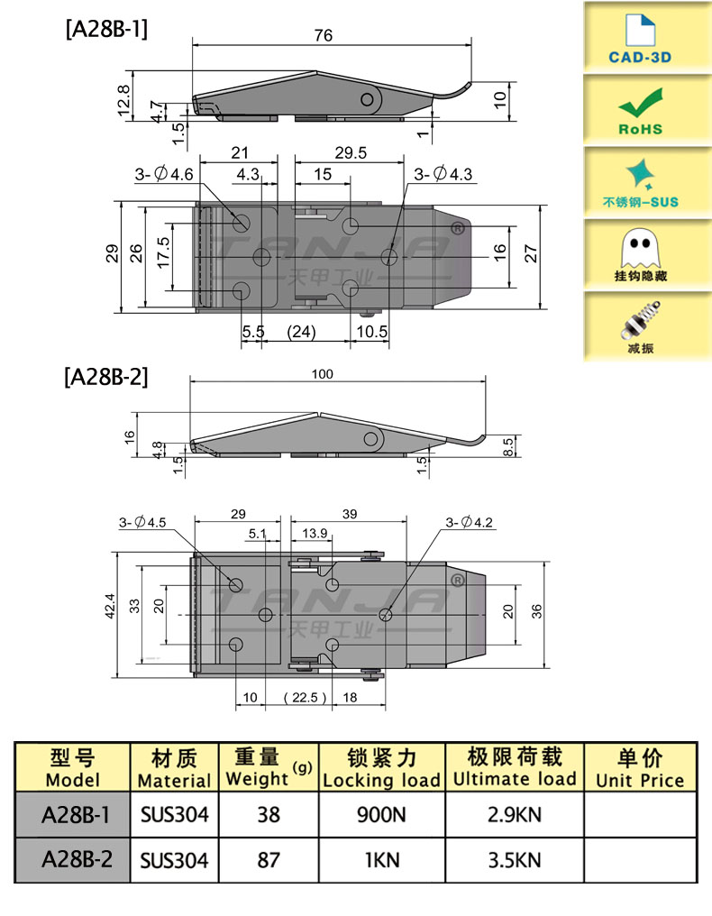 model Функции Длина (мм) Материалы Вес (g) Сила блокировки (N) 3D