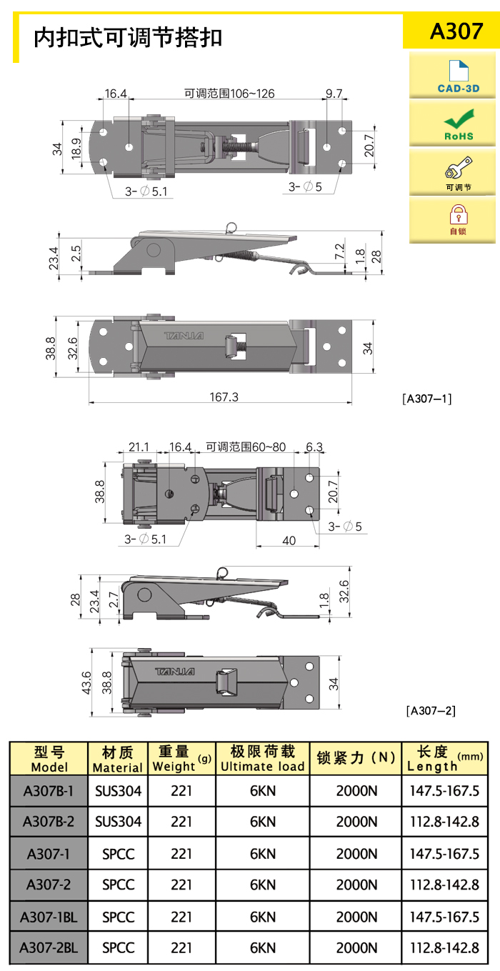 | A307B-2 | Внутренняя пряжка, регулируемая, самоблокировка | 112.8 - 142.8 | СУС304 | 199.01 | 2000 | Download |
