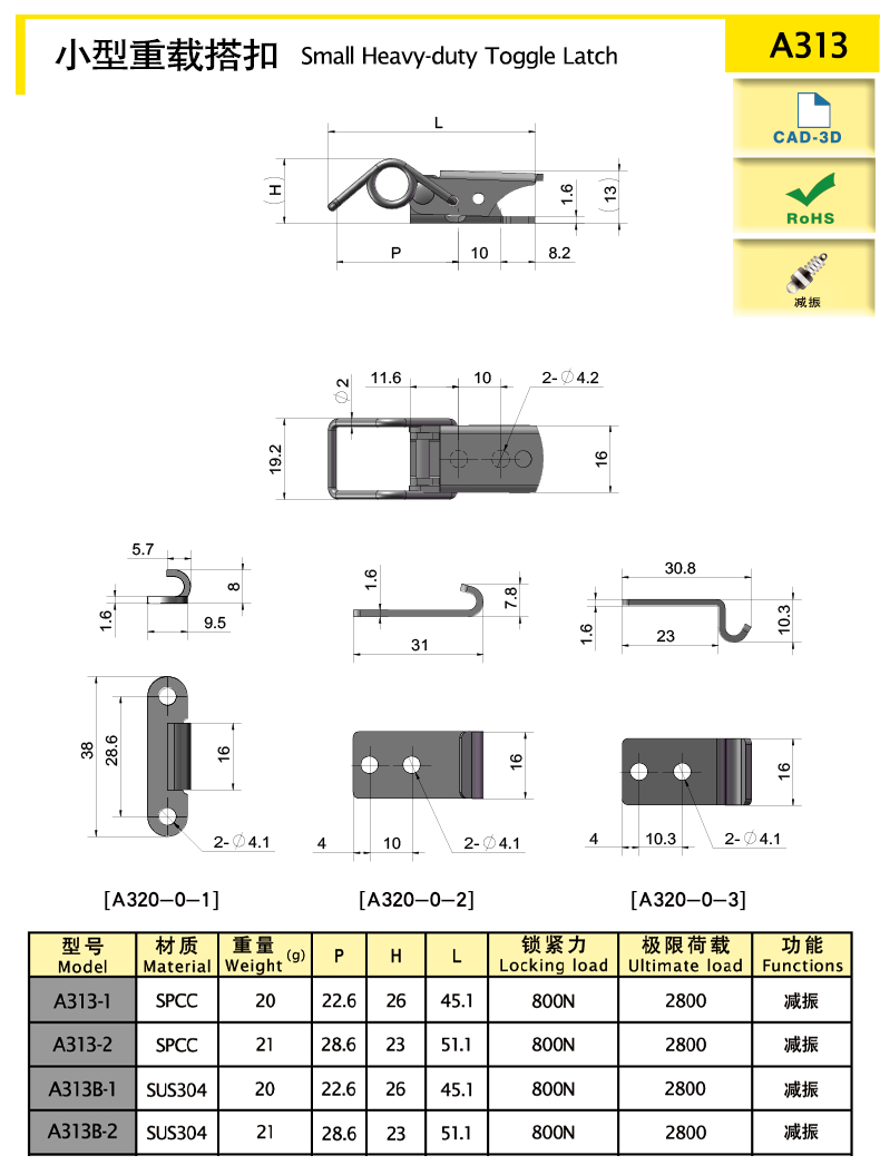 | model | Функции | Длина (мм) | Материалы | Вес (g) | Сила блокировки (N) | Предельная нагрузка (N) | 3D |