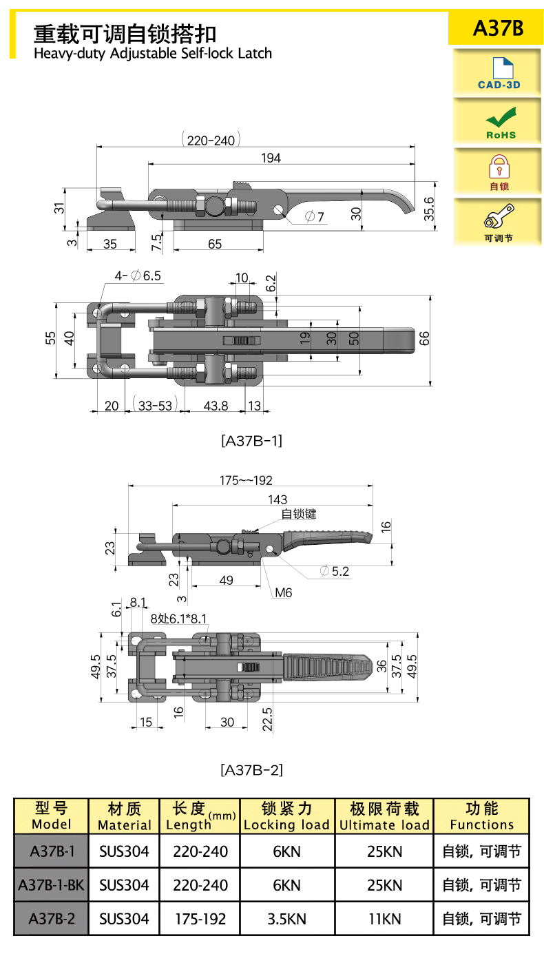 | A37B-1-BK | Самоблокировка, регулируемая | 220-240 | sus304 | 731.53 | 6000 | 25000 | Download |