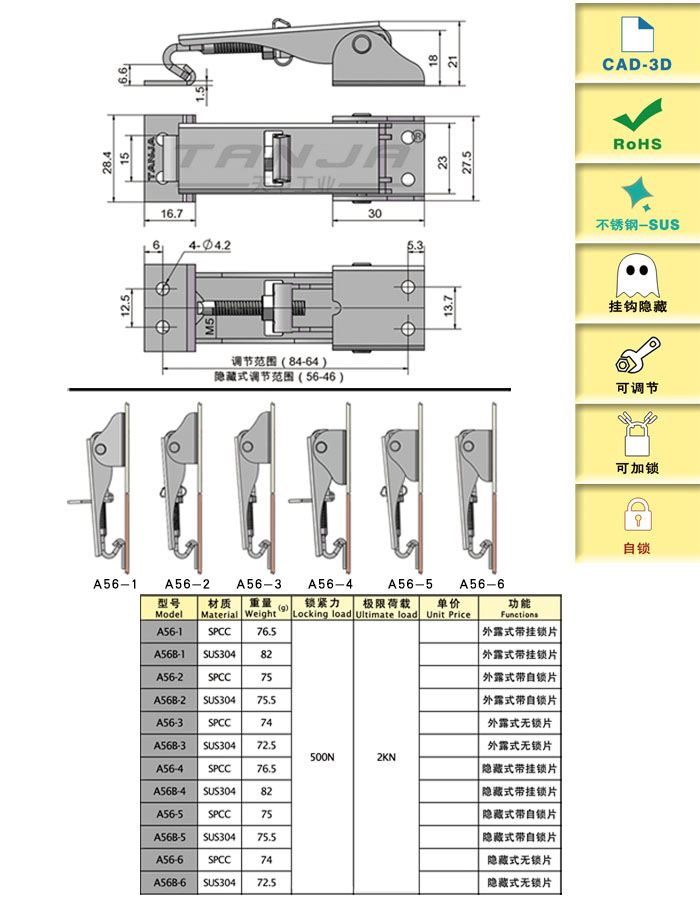 | A56B-2 | Внутренняя пряжка, регулируемая, самоблокировка | 81.5 | СУС304 | 72.41 | 500 | Download |