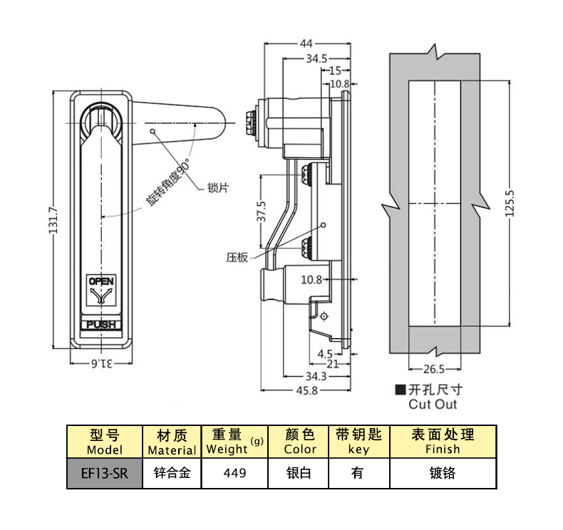Структурные функции: Закрытие ключом, нажатие ручки автоматически отскакивает, вращающаяся ручка открывается, можно поменять положение замка влево и вправо