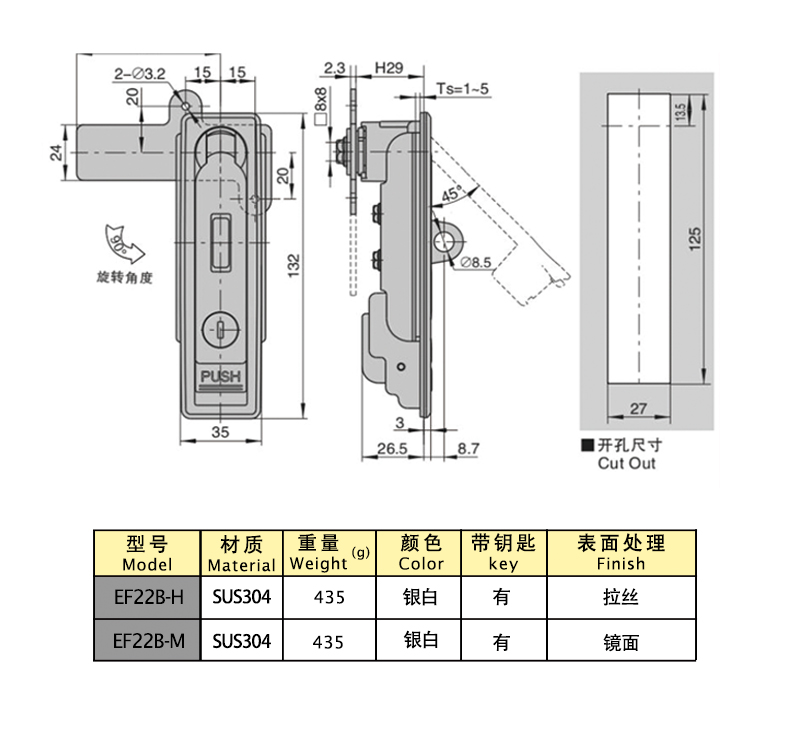 Структурные функции: Закрытие ключом, нажатие ручки автоматически отскакивает, вращающаяся ручка открывается, можно поменять положение замка влево и вправо