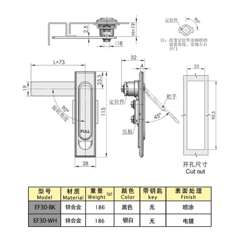 Структурные функции: Поднимите ручку влево и вправо, поверните и откройте, опустите ручку, выключите замок и переключите положение влево и вправо