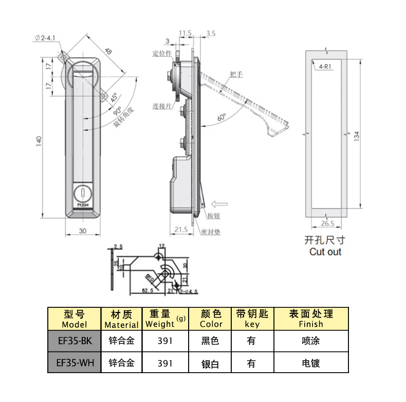 Структурные функции: Закрытие ключом, нажатие ручки автоматически отскакивает, вращающаяся ручка открывается, можно поменять положение замка влево и вправо