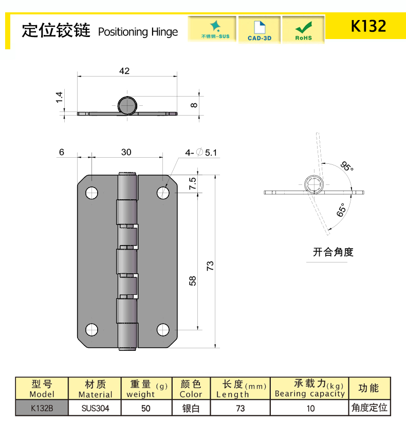 Максимальный угол открытия 160°, угол позиционирования 95°.