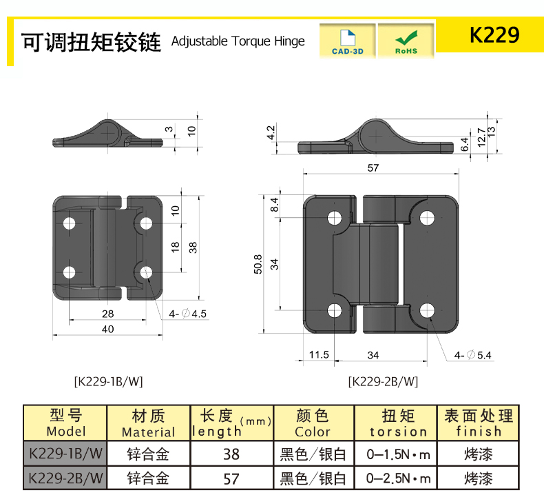 | K229-2BK | Цинковый сплав | 57 | Чёрный | 104.01 | Регулируемый крутящий момент | Download |