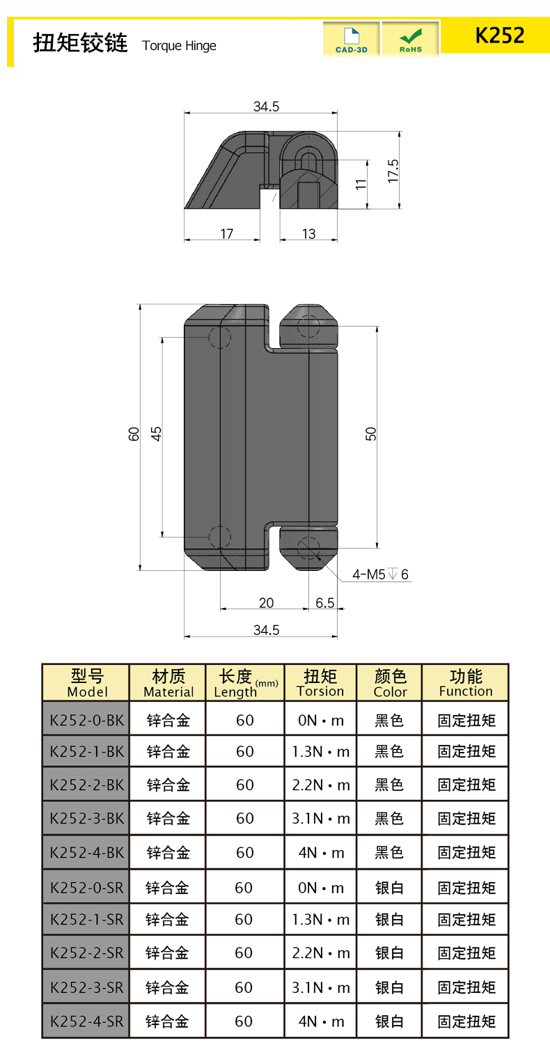 | K252-4-BK | Цинковый сплав | 60 | Чёрный | / | Постоянный крутящий момент | Download |