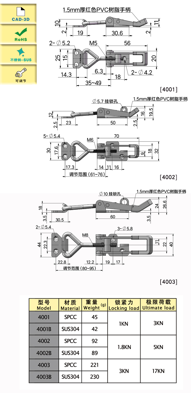 | model | Функции | Длина (мм) | Материалы | Вес (g) | Сила блокировки (N) | Предельная нагрузка (N) | 3D |
