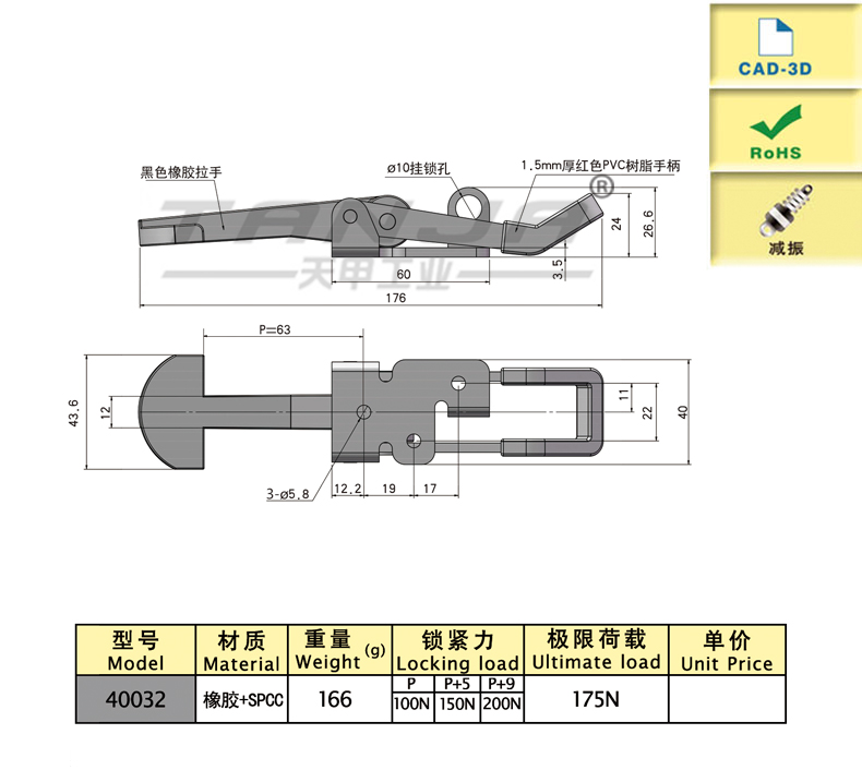 | model | Функции | Длина (мм) | Материалы | Вес (g) | Сила блокировки (N) | 3D |