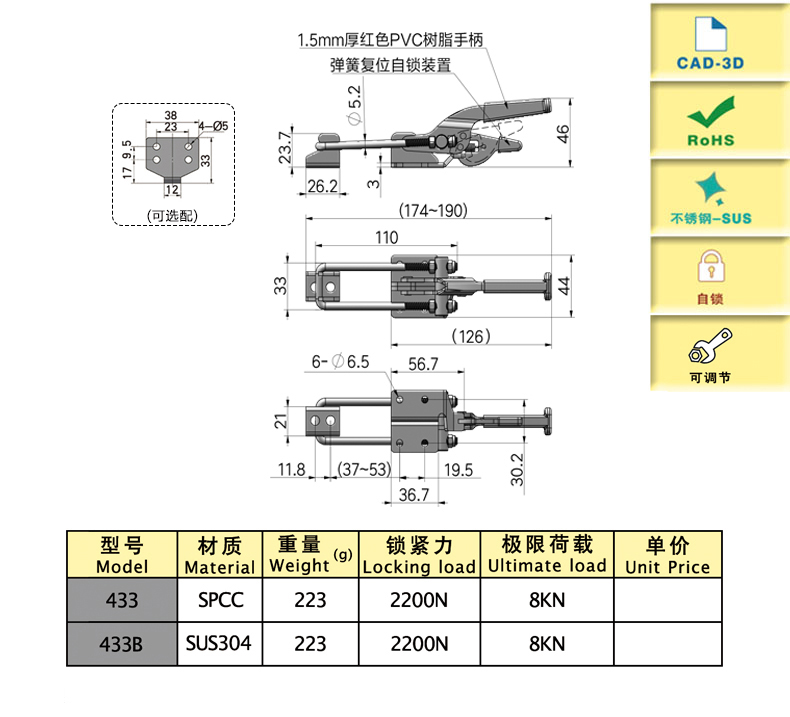 Подходит для случаев, несущих большую тягу, вертикальная установка (крюк и застежка на 90°)
